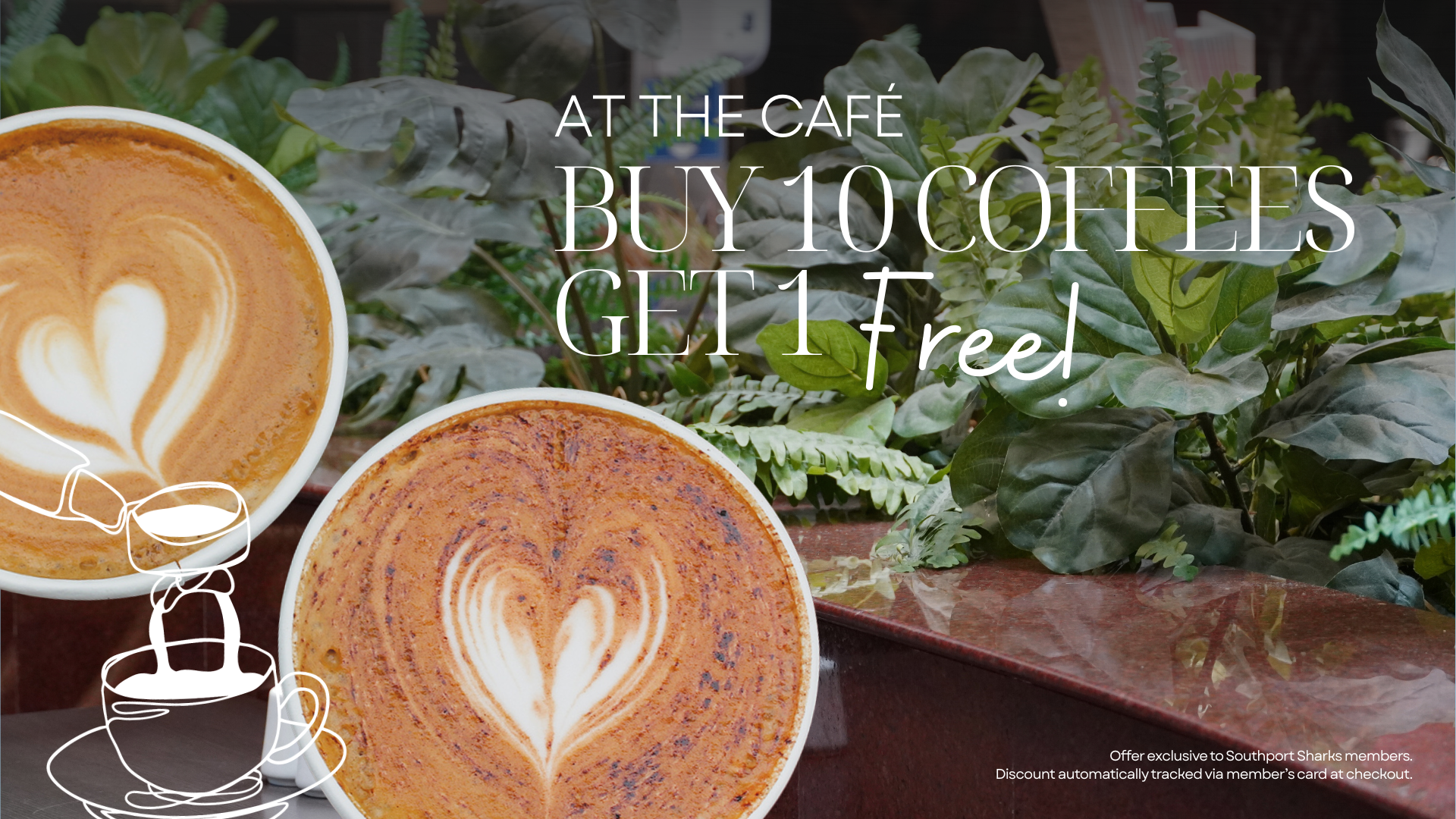 Sharks members recieve a FREE coffee every time you purchase 10 coffees. The discount is automatically tracked via your members card at the checkout.